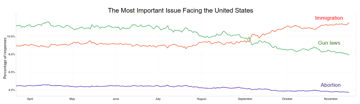 • Data from occam indicates a notable trend: topics traditionally aligned with conservative viewpoints, such as immigration, are perceived as increasingly important, whereas issues often associated with liberal stances, including gun control and abortion rights, are showing a decline in importance.
