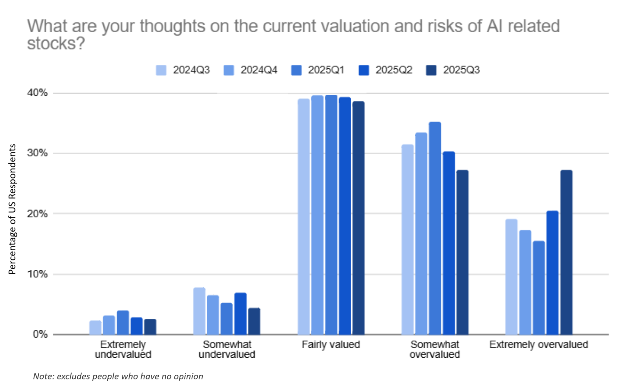 - Occam’s continuous tracking of retail investor sentiment toward both the broader stock market and AI equities reveals a sharp shift in perceptions. The proportion of respondents who now consider AI equities to be “extremely overvalued” has climbed to 27%. Overall, nearly 55% of those expressing an opinion categorize AI stock valuations as either somewhat or extremely overvalued. Conversely, the share of respondents who view AI equities as undervalued has continued to decline steadily over the past year.