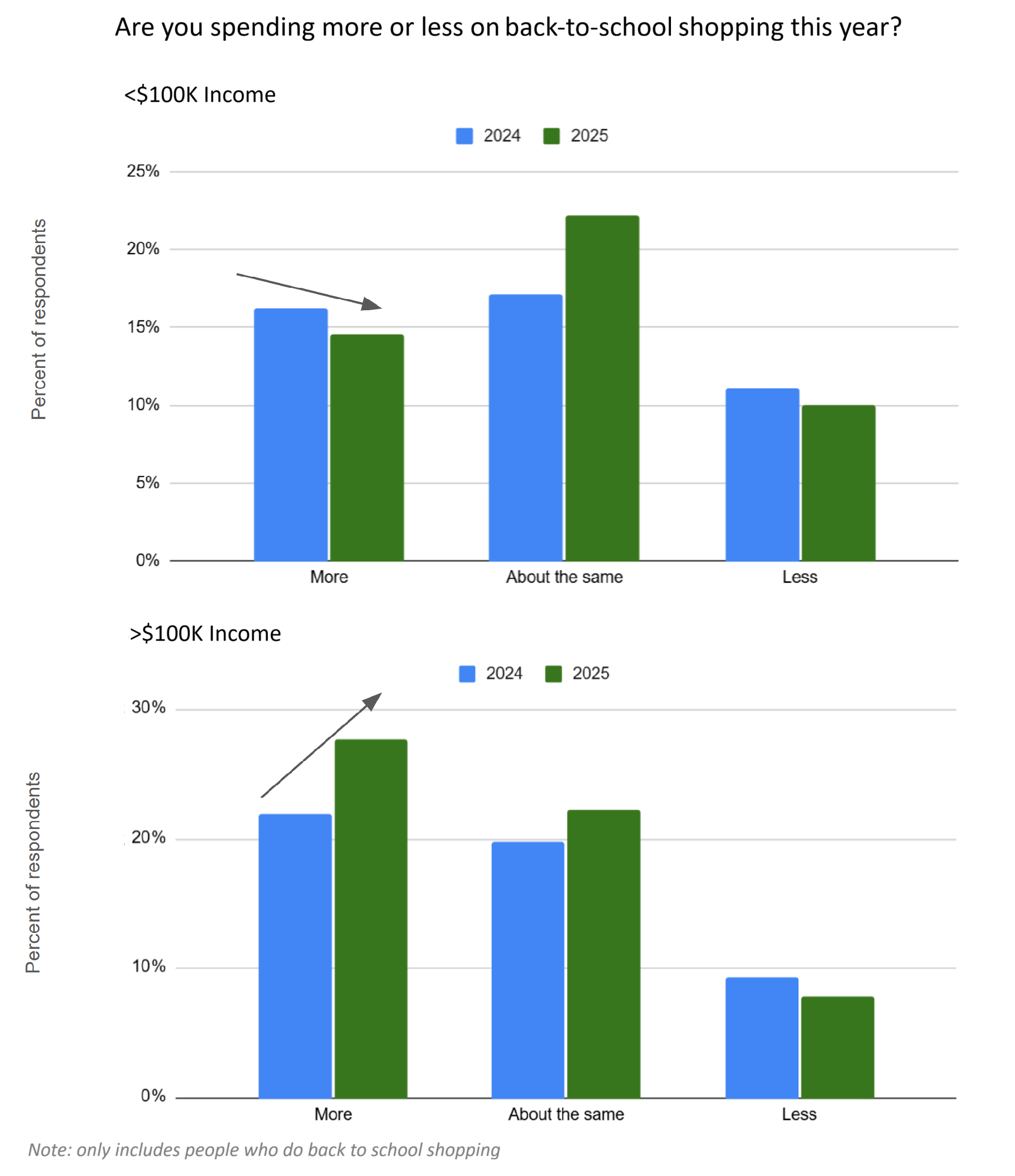 - Despite these headwinds, consumers remain resilient with more respondents reporting spending more this year compared to last, while fewer reported spending less (data available upon request). However, the results vary significantly by income level—households earning over $100,000 annually are more likely to increase spending, while those earning under $100,000 are more likely to cut back.