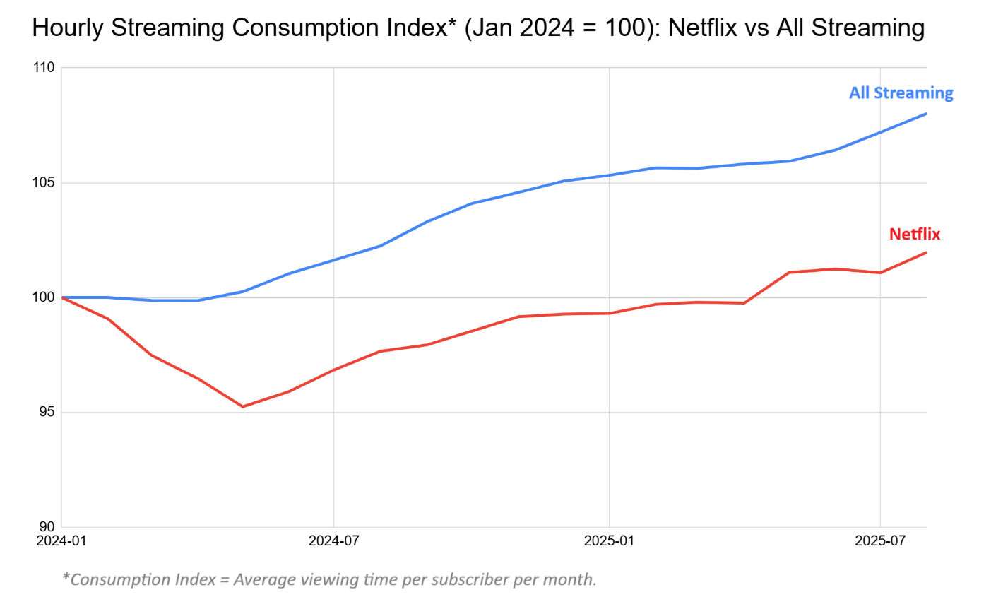 - In contrast, other streaming providers continue to show faster growth in viewership per subscriber, in part likely because they’re coming off a lower base.