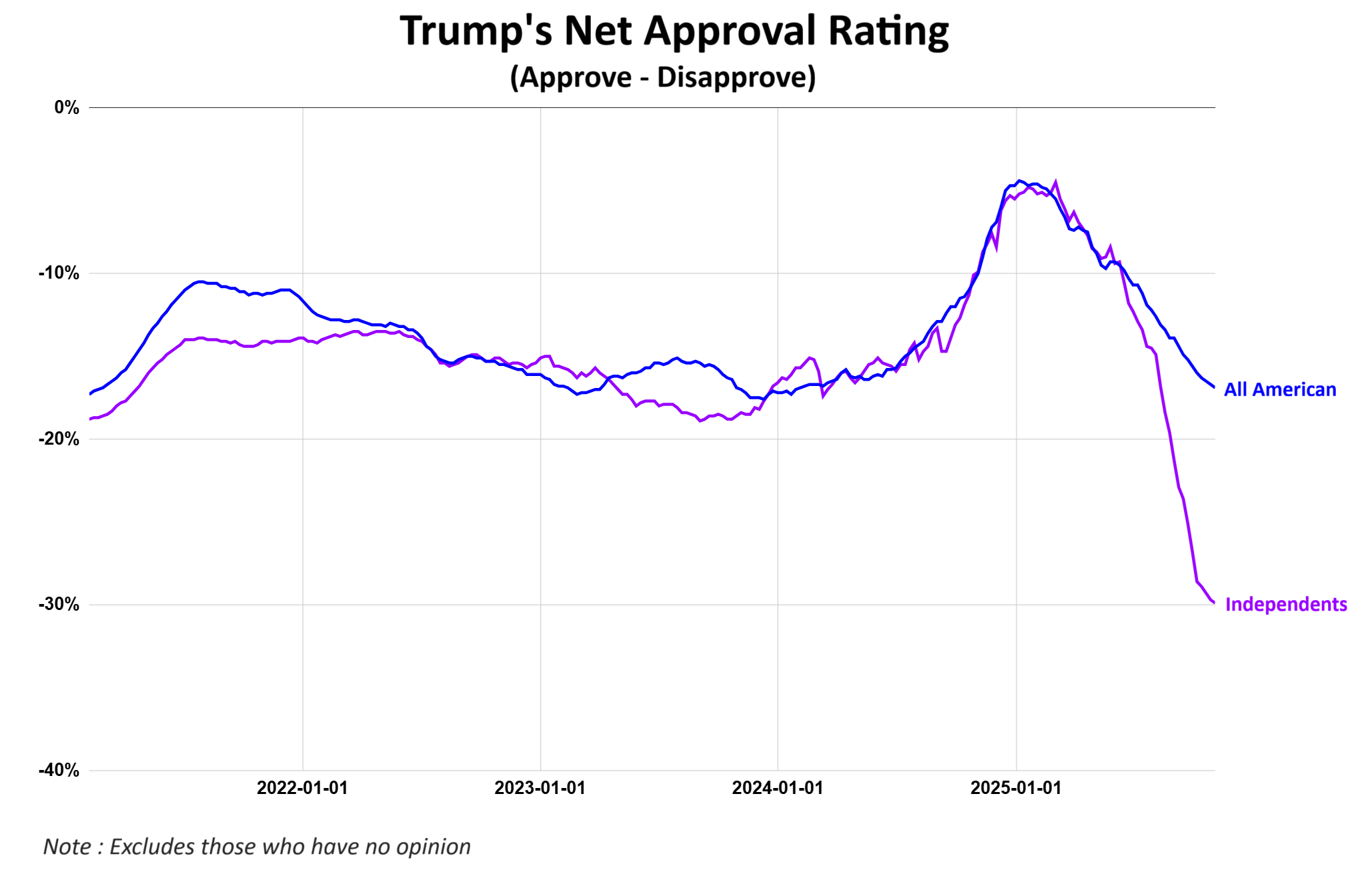 - Occam’s analysis of approval ratings show that Trump’s net approval, which spiked briefly after the 2024 presidential election, has since declined sharply. The drop has been most pronounced among Independents, where his support collapsed ahead of the 2025 elections, driven in part by growing frustration over affordability.